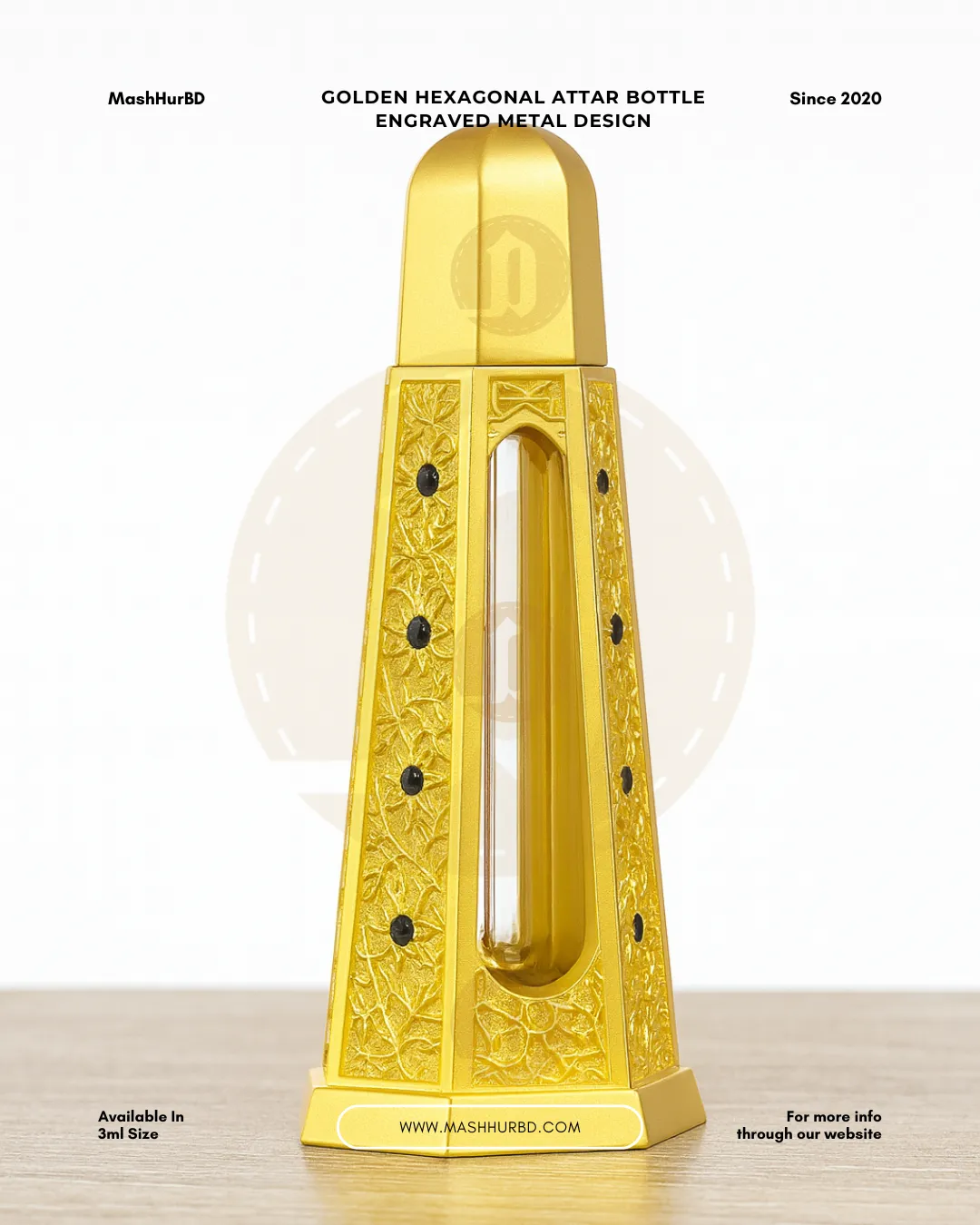 Golden Hexagonal Attar Bottle – Engraved Metal Design | 3ml